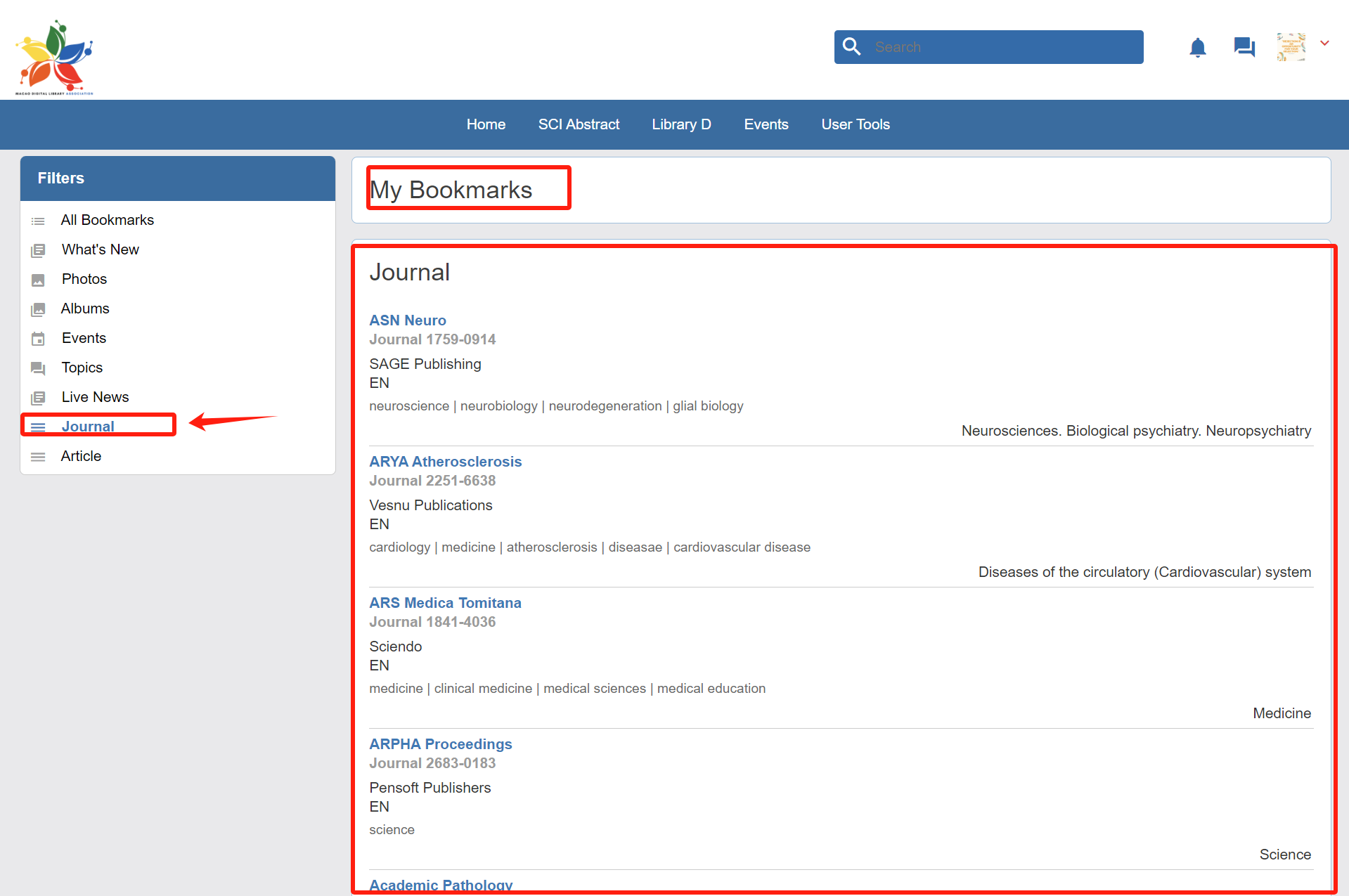 Select journals and click the ❤ icon or thick the check box to save them in the “Journals” section under My Bookmarks.